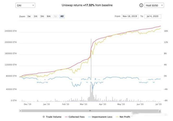 Uniswap 上 ETH/DAI 资金池的回报(vs 持有 50/50 的 ETH/DAI),来源:ZumZoom Analytics