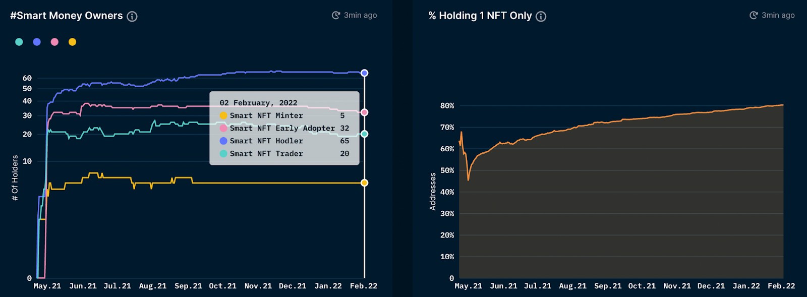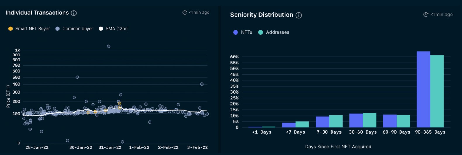 随着每天发布 NFT 项目的数量,几乎不可能跟上所有这些项目。一种策略是追随精明的资金(Smart Money)并关注引起他们兴趣的项目,Nansen NFT 仪表板可以帮助实现这一点。您可以在“NFT 大神模式(God Mode)”查看特定项目的交易数据,在“Mint Master”上查看铸造数据,并在“NFT Smart Money”上查看过去 24 小时的Smart Money活动概览。